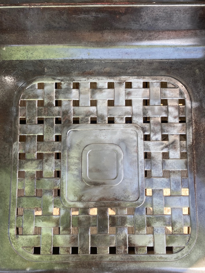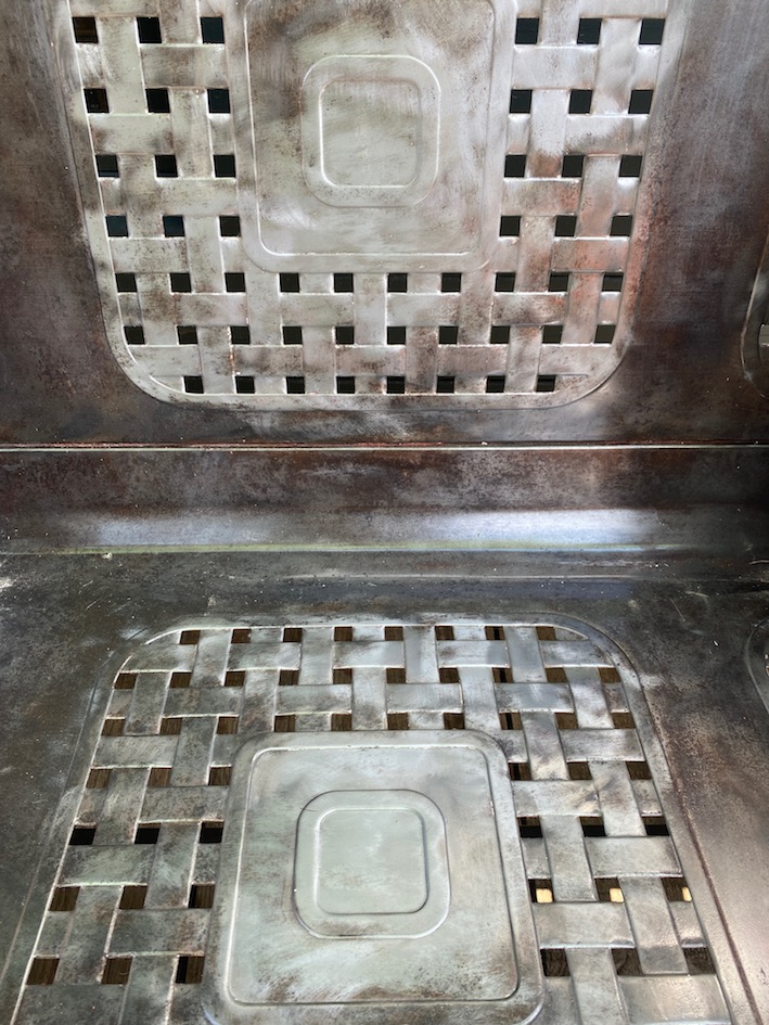 En métal avec des motifs en carrés perforés sur le dossier