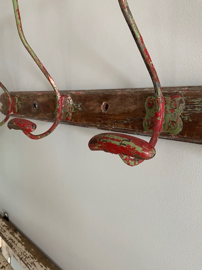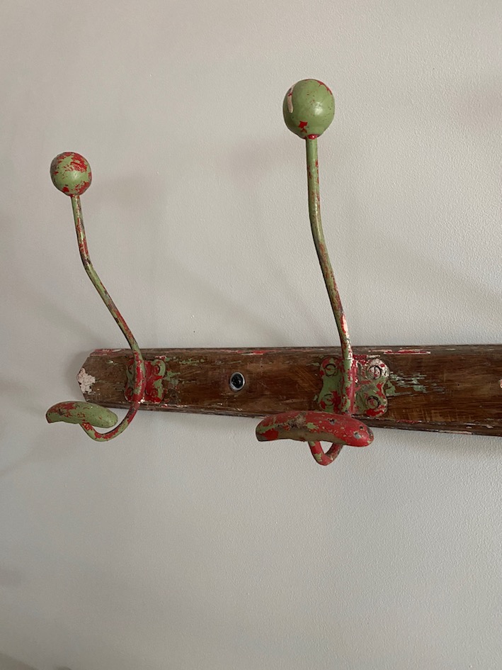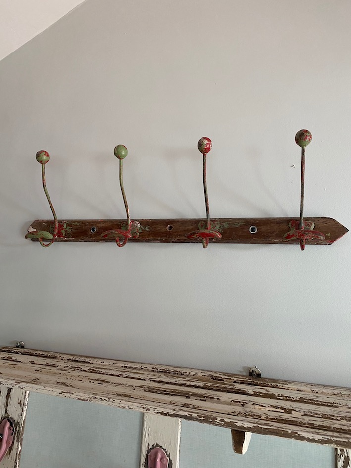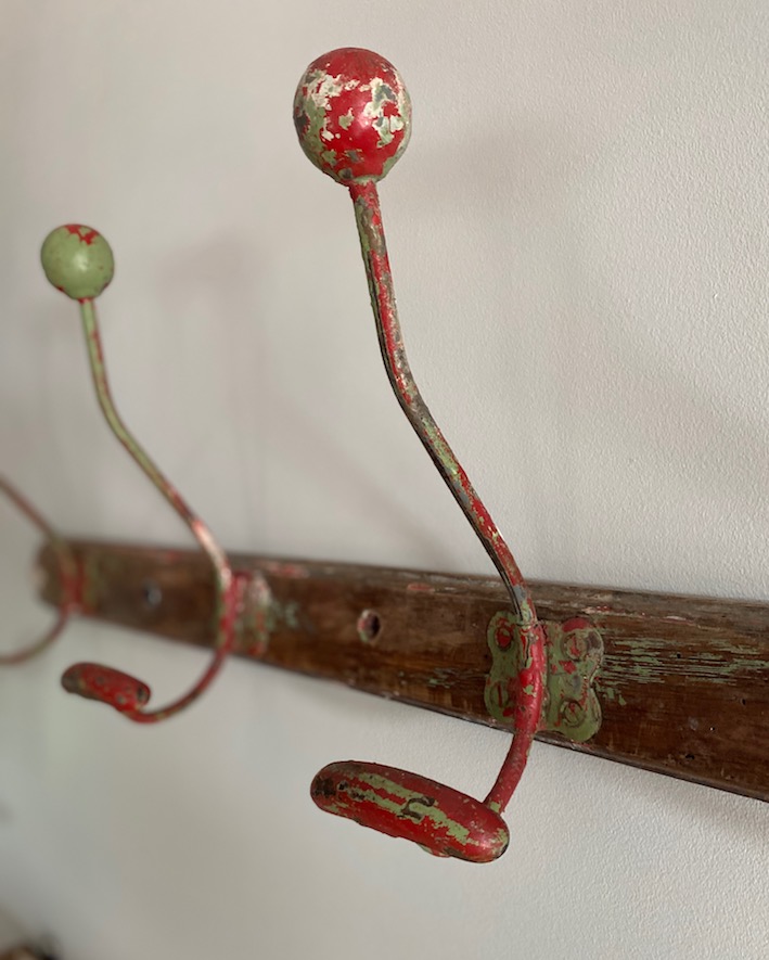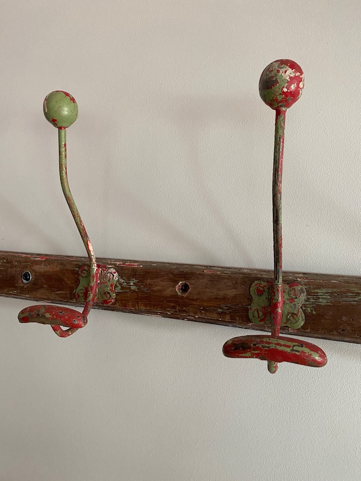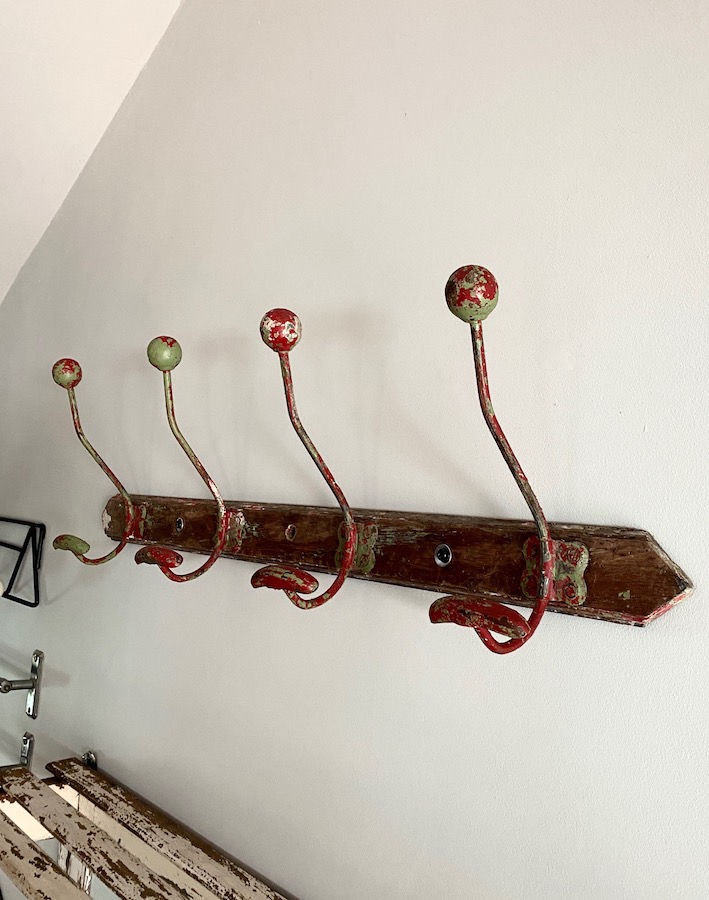 Quatre patères en métal sont fixées sur du bois biseauté.